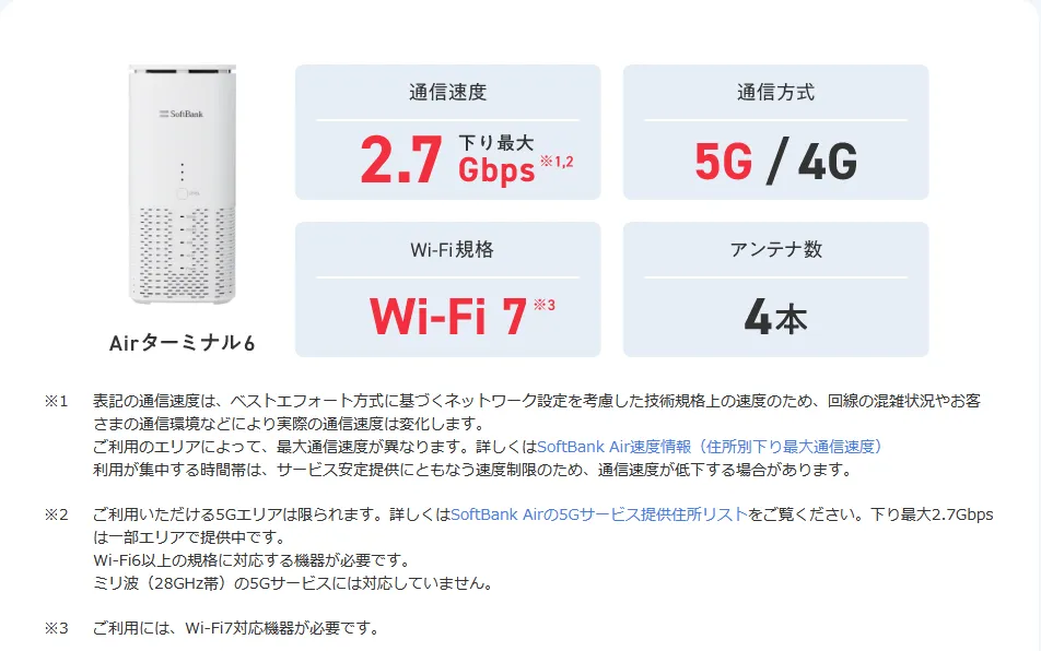 SoftBank Air(ソフトバンクエアー)で通信に必要な通信端末は4G/5G回線で通信可能な「Airターミナル6」の購入またはレンタルが必要となります。