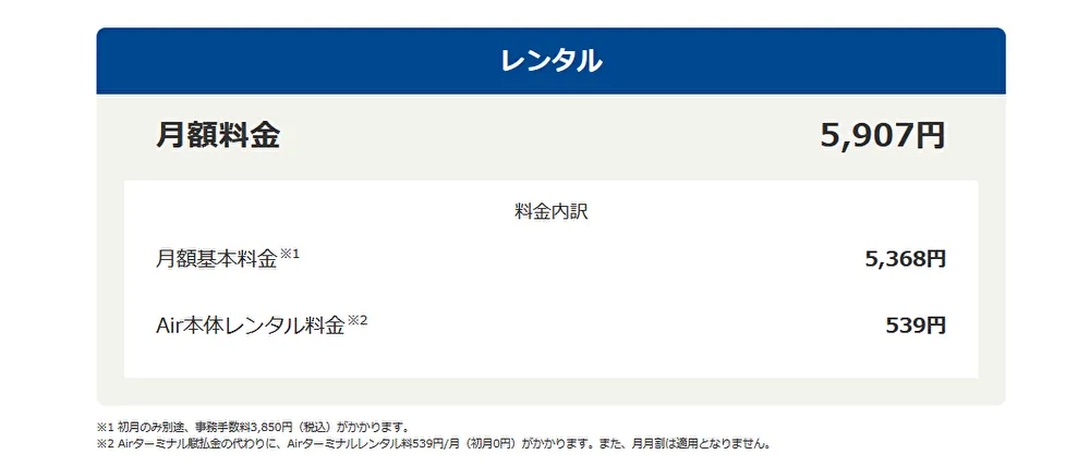 端末レンタルの場合は、月額基本料金: 5,368円(税込)に端末レンタル料(月額539円)で利用できます。