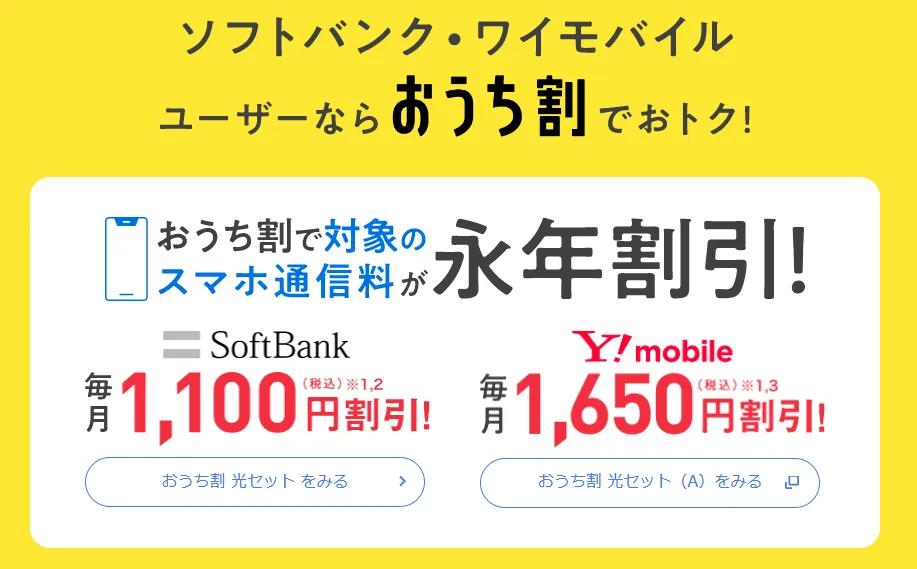 ソフトバンクの提供している自宅用インターネット回線なので、ソフトバンク光と同様にソフトバンクとワイモバイルの携帯・スマホとのセット割「おうち割」も受けらます。