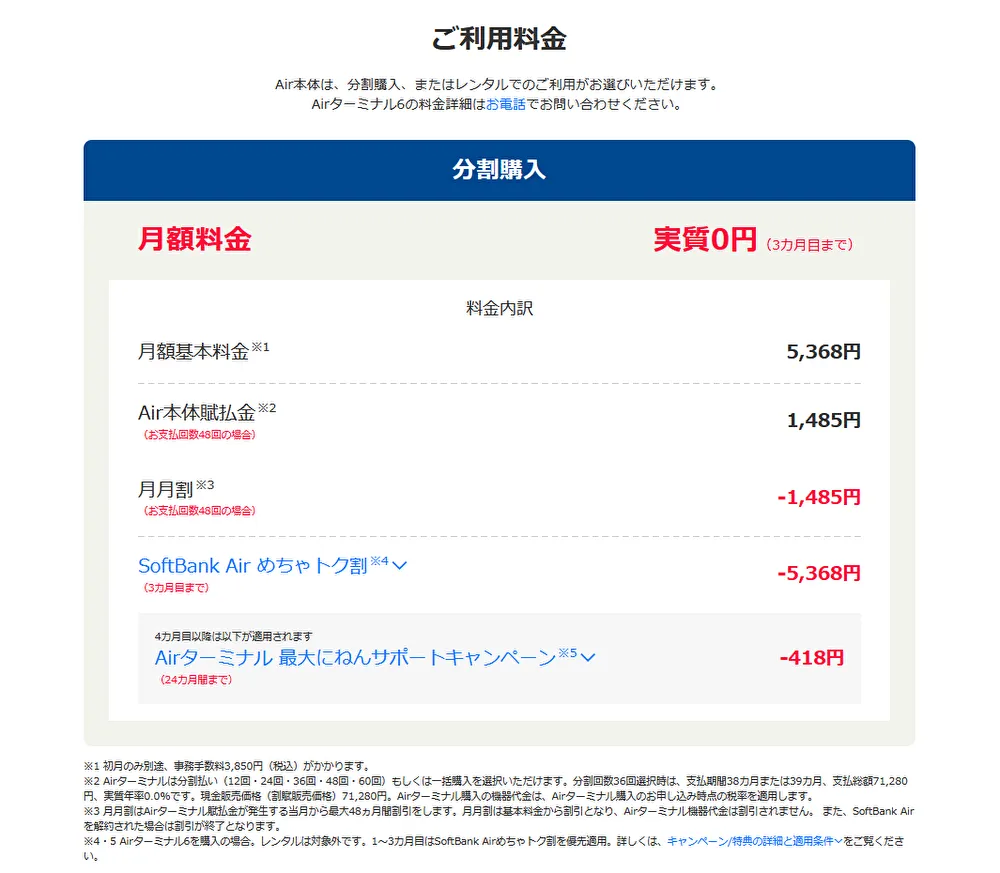 - 「SoftBank Air めちゃトク割」の適用により、月額基本料金が無料になります。