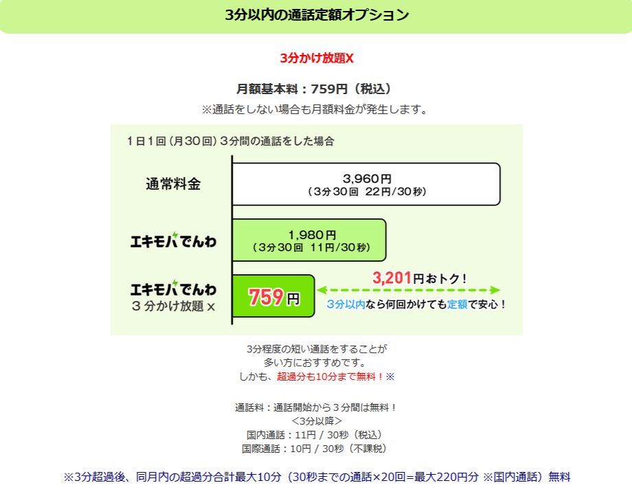また、3分以内の通話が月額基本料:759円(税込)でかけ放題となる3分以内の通話定額オプションがあります。