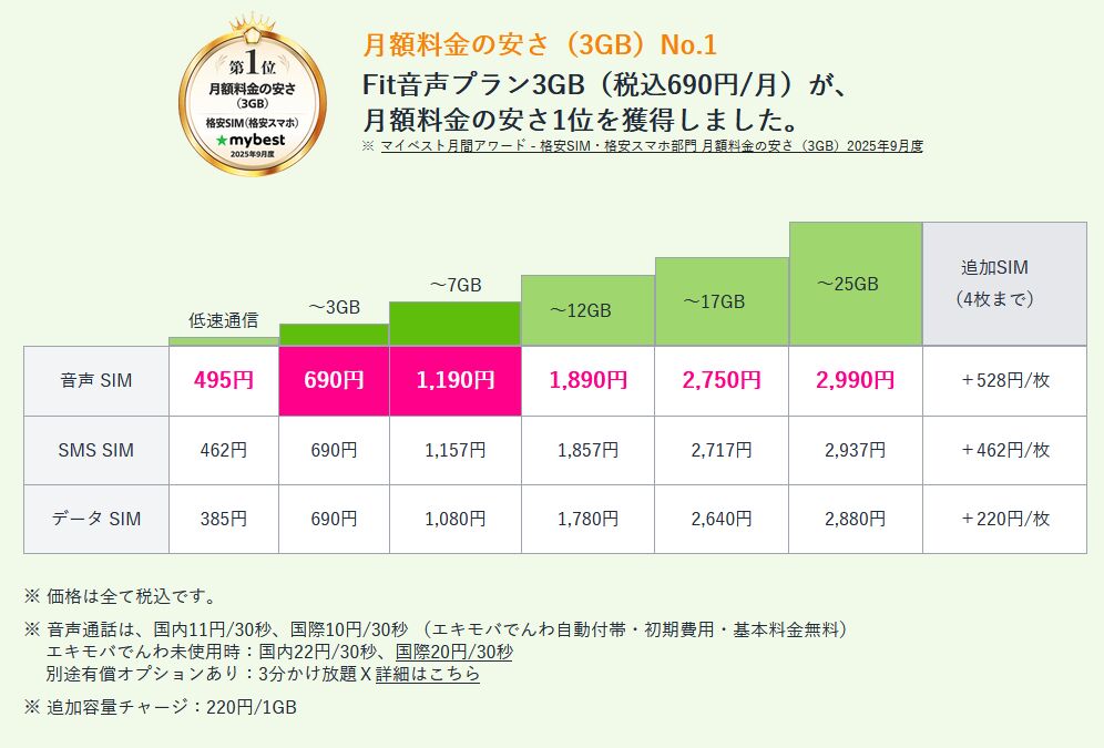 毎月の使用量によって料金が変わるので無駄なく使え、上限25GBまで使っても音声通話機能付きSIMの場合では2,990円/月(税込)となり、それ以上は定額料金となります。