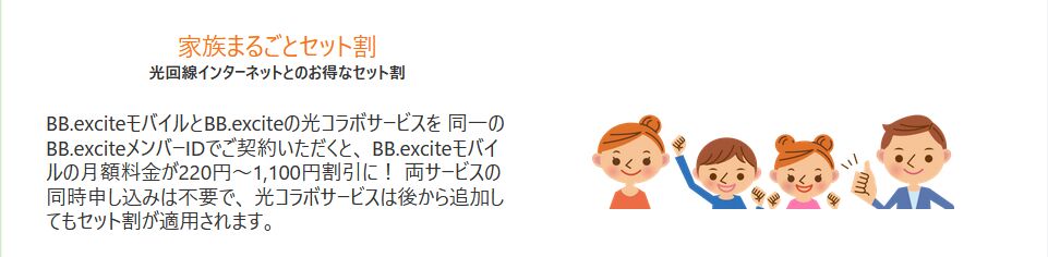 「家族まるごとセット割」は、BB.exciteモバイルBB.exciteの光コラボサービス同じメンバーIDで契約することで、BB.exciteモバイルの音声通話機能付きSIM1枚ごとに月額料金から220円が割引されるお得なサービスです。